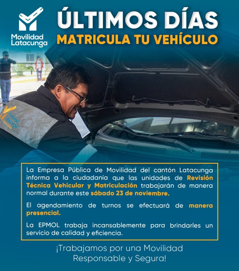 ¡ATENCIÓN CONDUCTORES! ¡ATENCIÓN!La Revisión Técnica Vehicular y Matriculación trabajará de manera normal este sábado 23 de noviembre.¡ Cumple y matrícula tu vehículo en Latacunga !#PorUnaMovilidadResponsableYSegura 22/11/2024